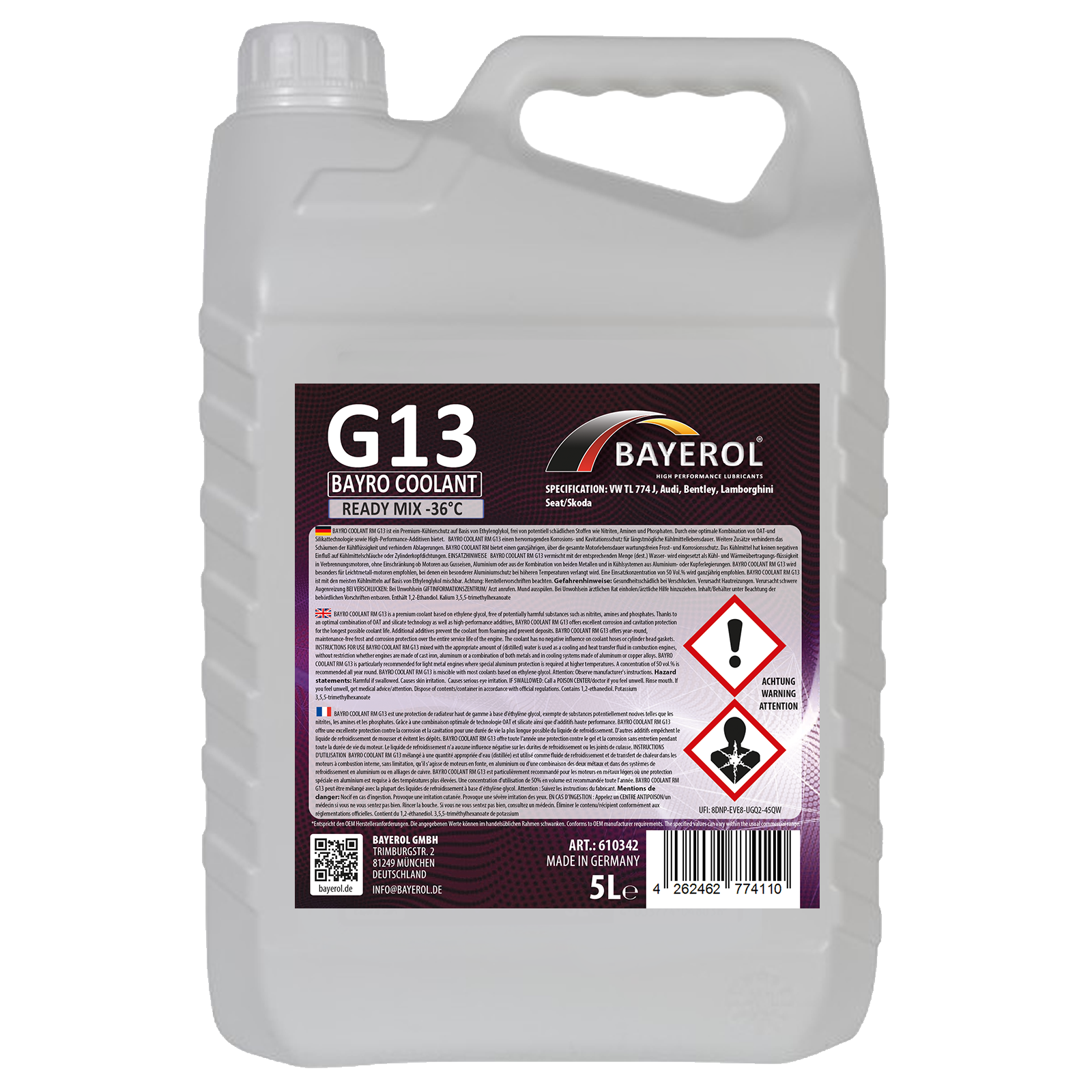 BAYRO COOLANT RM -36 G13 ist ein Premium-Kühlerschutz auf Basis von Ethylenglykol, frei von potentiell schädlichen Stoßen wie Nitriten, Aminen und Phosphaten. Durch eine optimale Kombination von OAT-und Silikattechnologie sowie High-Performance-Additiven bietet. BAYRO COOLANT RM -36 G13 einen hervorragenden Korrosions- und Kavitationsschutz für längst mögliche Kühlmittellebensdauer. Weitere Zusätze verhindern das Schäumen der Kühlflüssigkeit und verhindern Ablagerungen. BAYRO COOLANT RM -36 G13 bietet einen ganzjährigen, über die gesamte Motorlebensdauer wartungsfreien Frost- und Korrosionsschutz. Das Kühlmittel hat keinen negativen Einfluss auf Kühlmittelschläuche oder Zylinderkopfdichtungen.